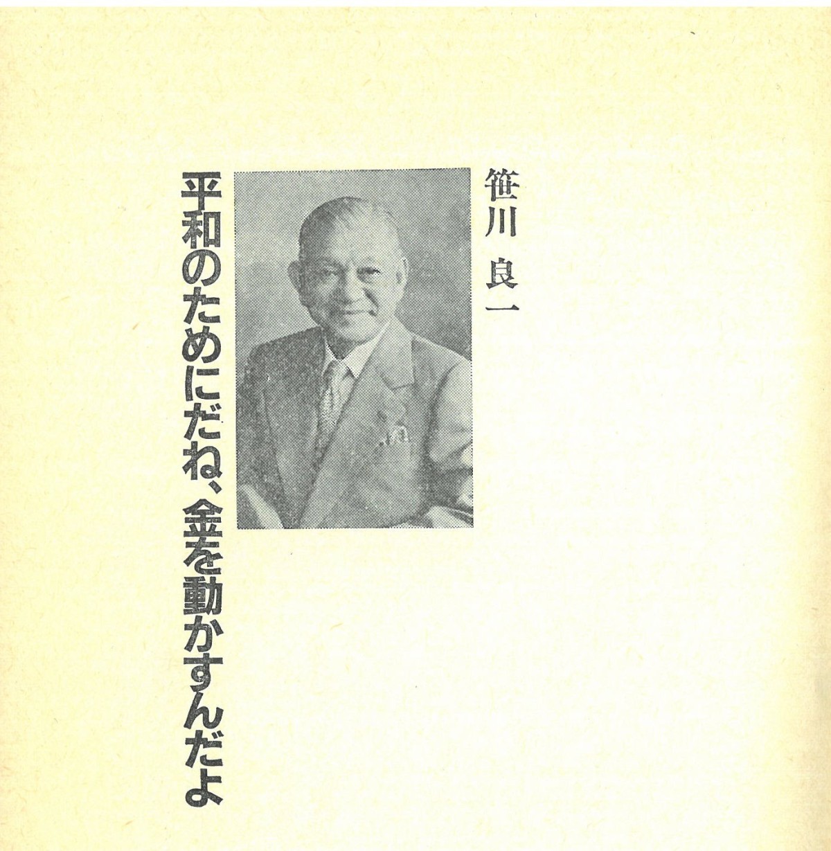 また、親族では、四七年の衆院選で、次男の笹川堯が立候補(落選) したり、四九年の参院選では姪の婿にあたる糸山英太郎が立候補(当選)したりしている。 とくに糸山の場合は"金権選挙と非難され、 良一の弟了平(五七年四月死去)はその件で実刑判決を受けている。 このとき本人は「赤飯をたいて入所を祝った」と、きわめて鷹揚。このほか、国連に七億八〇〇〇万円、海洋博に三〇億円を寄付するとともに、宇宙博を主催したり、対馬沖に沈んでいたロシア軍艦ナヒモフ号(プラチナが積まれているそうだ)を引き揚げようとしたり、話題 にこと欠かない。